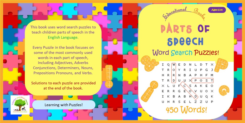 This book uses word search puzzles to teach children parts of speech in the English Language. Every Puzzle in the book focuses on some of the most commonly used words in each part of speech, Including Adjectives, Adverbs Conjunctions, Determiners, Nouns, Prepositions Pronouns, and Verbs. Solutions to each puzzle are provided at the end of the book. Every child can have fun learning the different parts of speech with 450 most commonly used words in the English Language. The book is suitable for ages six to fourteen.